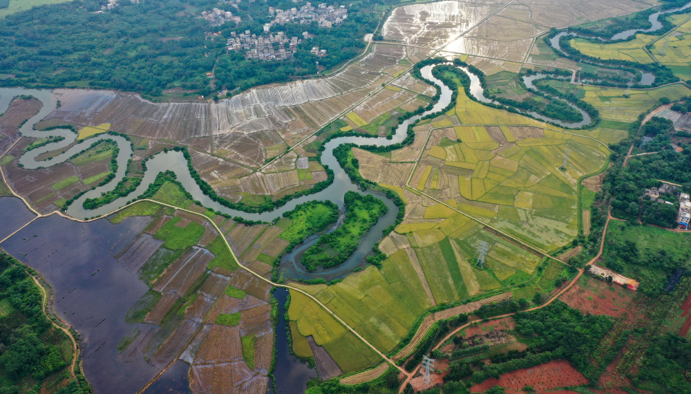??谑腥獌砂兜乃具M入夏收時節(jié),一片片成熟的稻田與蜿蜒曲折的河道交織,勾勒出一幅美麗的畫卷。